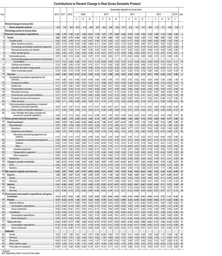 De acordo com a estimativa divulgada pelo Bureau of Economic Analysis (BEA), a economia norte-americana cresceu 1,8% em cadeia (taxa anualizada) no 1º trimestre de 2013, o que compara com um crescimento de 0,4% no 4º trimestre de 2012. Esta variação reflete contributos positivos das despesas de consumo final individual (1,83 p.p.) e da formação bruta de capital do setor privado (0,96 p.p.); e contributos negativos da procura externa líquida (- 0,09 p.p.) e da formação bruta de capital e despesas em consumo do setor público (-0,93 p.p.).
