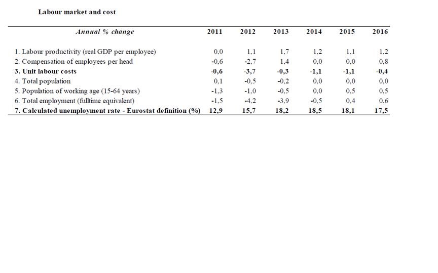 A Comissão Europeia prevê uma evolução do PIB real de -3,2% em 2012 para 0,6% em 2014 e de 1,8% em 2016. Prevê-se que o comportamento do PIB registado em 2012 resulte, essencialmente, de uma contração da procura interna (-7,2 p.p.) superior ao crescimento da procura externa líquida (4,0 p.p.).