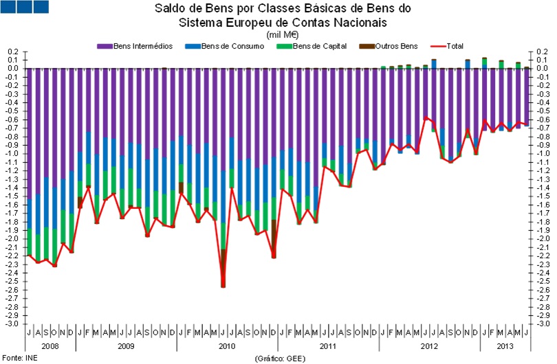 Em junho de 2013, o Saldo de Bens por Grandes Categorias Económicas e Classes Básicas de Bens registou o valor de -656,0 milhões de euros, destacando-se no primeiro caso a categoria de Bens Intermédios com um valor de -664,9 milhões de euros e no segundo os Combustiveis e Lubrificantes com um valor de -472,4 milhões de euros.